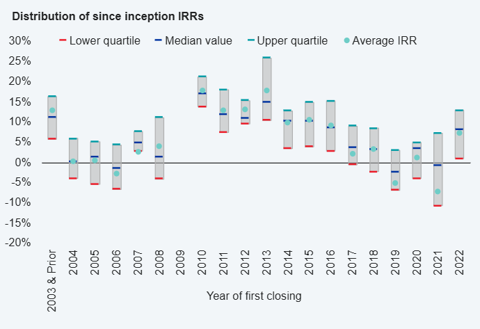 - The two strongest vintage groups are still represented by funds launched before 2002 and between 2011 and 2013. They posted average IRRs of 14.73% and 14.16%, respectively.