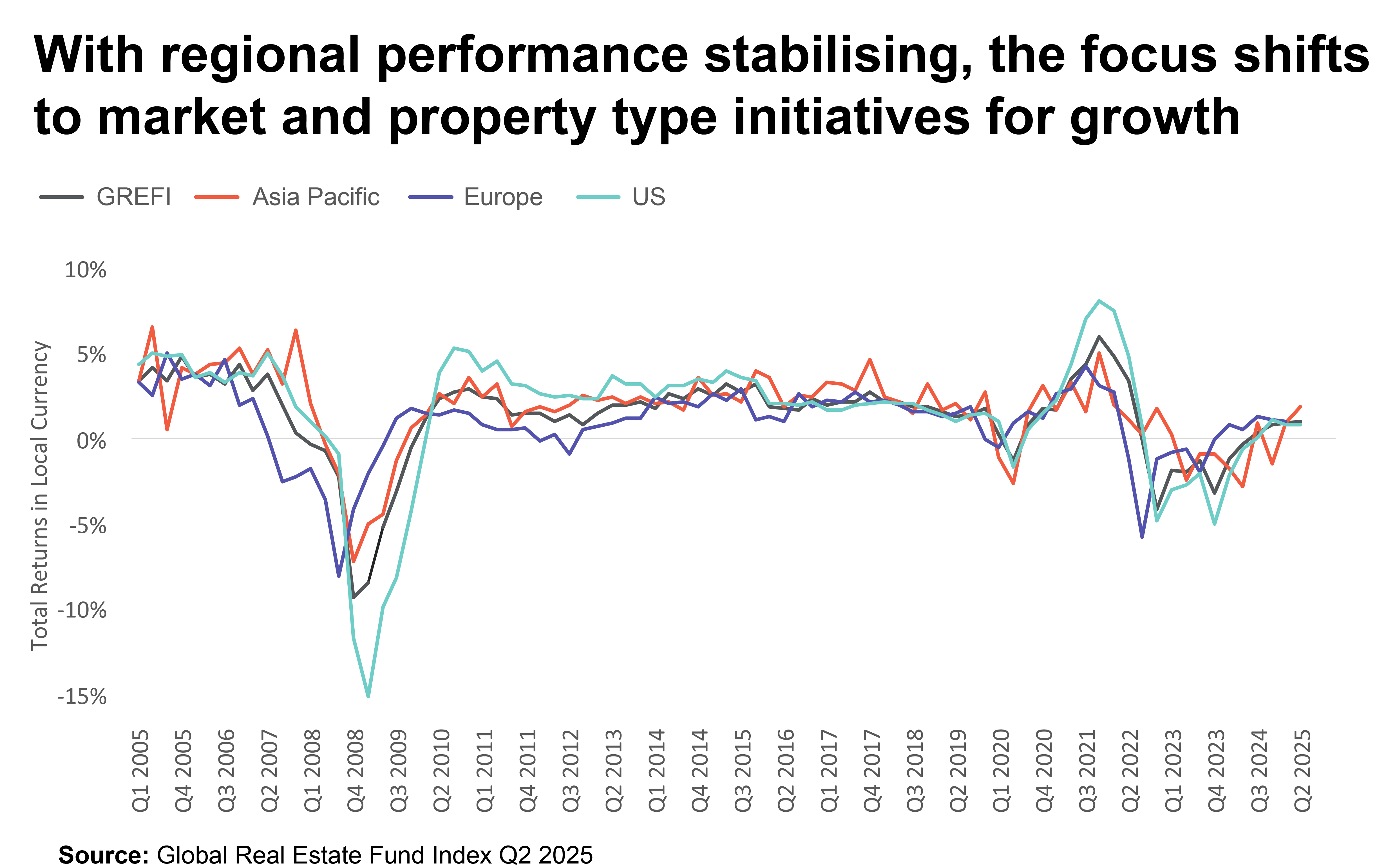 - For the fourth consecutive quarter global real estate returns remained in positive territory with a 1.01% return in Q2 2025.