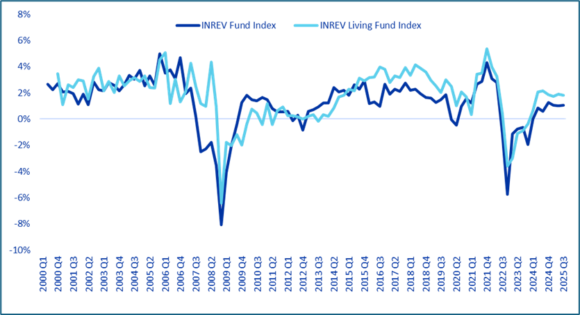 With 25 years of historical data, the Living Fund Index offers a comprehensive view of historical performance in this segment. And the results speak for themselves: showing living funds have outperformed the wider Fund index not only in recent quarters but consistently over time. The Q3 2025 release includes 38 residential funds and 3 student housing funds with a combined Gross Asset Value (GAV) of €60.4 billion.
