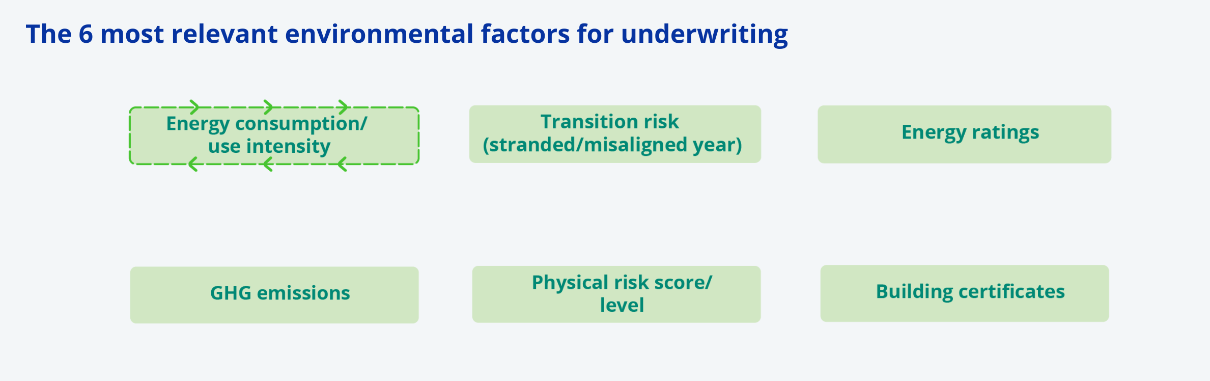 In April 2025, INREV published the initial output, which identified the six most relevant environmental factors affecting real estate investment underwriting. Selected from a long list of possible candidates, these factors are energy consumption, energy ratings, GHG emissions, stranded / misaligned (climate transition) year, physical climate risks, and building certifications.