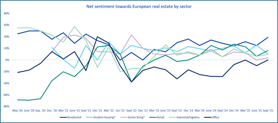 It’s not just about investment intentions; market sentiment tells a similar story. Industry experts consistently express a more positive outlook for residential, a trend visible over the last six years. The only notable exception was in 2022, when rising energy costs and interest rates shook confidence. Since residential assets typically generate lower income returns, they are naturally more sensitive to these shifts.